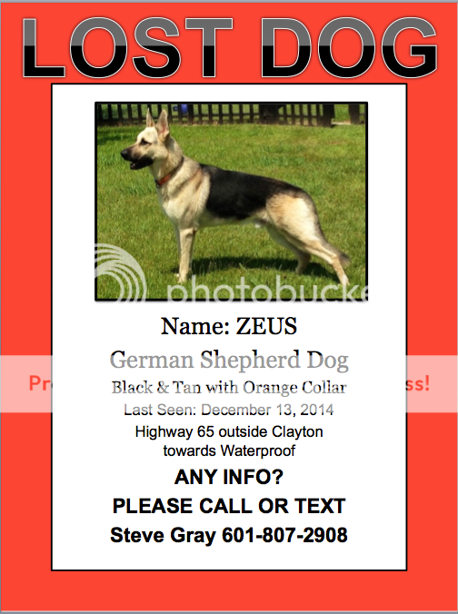 My German Shepherd, Zeus, is missing. He was separated from us in the woods at our place on Hwy 65 outside Clayton, LA. Has been missing since Saturday, December 13. If you happen to see him please call us at 6018072908. A large reward will be offered. No questions asked