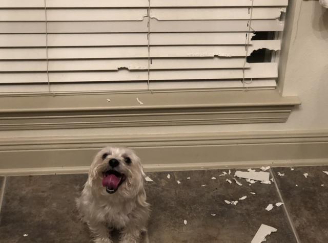 So we had left for a week in Costa Rica, and since he hates being boarded, we left him home and had a neighbor’s son come let him out and feed him a few times a day. I don’t think the kid came as much as he was supposed to (due to the poop in my house), so I think every time my dog heard a car he was trying to look for us through the window and couldn’t…so he just ate the blinds.