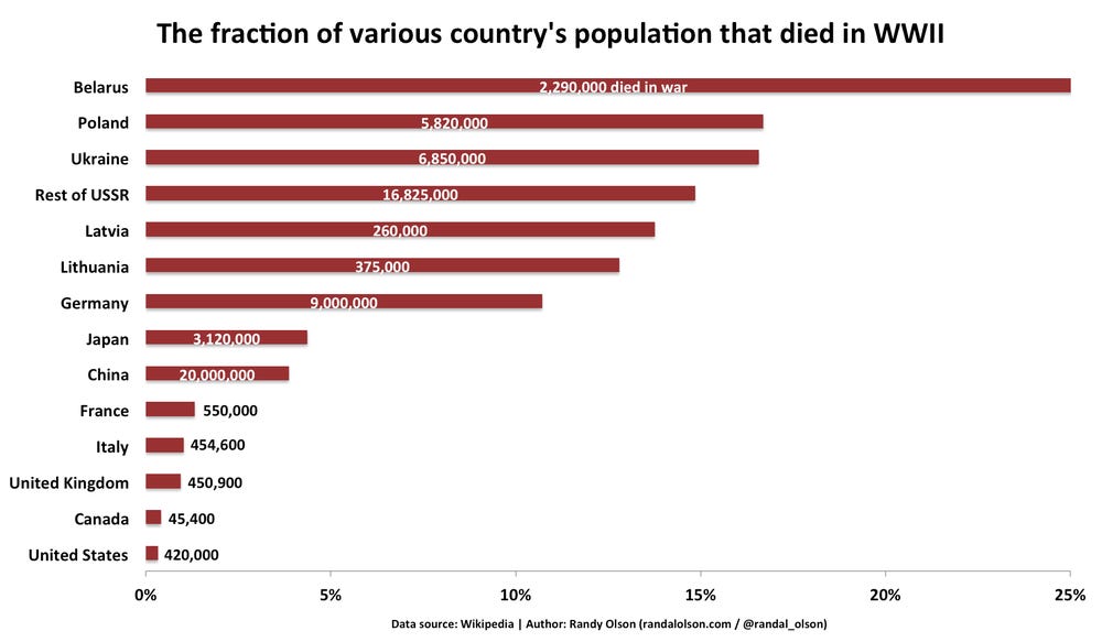 World War II was the deadliest conflict in human history, resulting in an estimated 70 to 85 million deaths worldwide, or roughly 3% of the 1939 global population. The conflict included around 25 million military deaths and over 38-50 million civilian deaths, with the Soviet Union and China suffering the highest total casualties.
