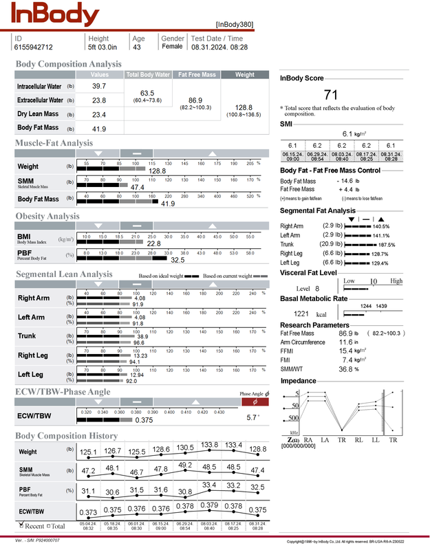I’ve thought about getting a DEXA scan just to see what it says. InBody scans seem to fluctuate based on water, inflammation, bladder, cycles, etc…