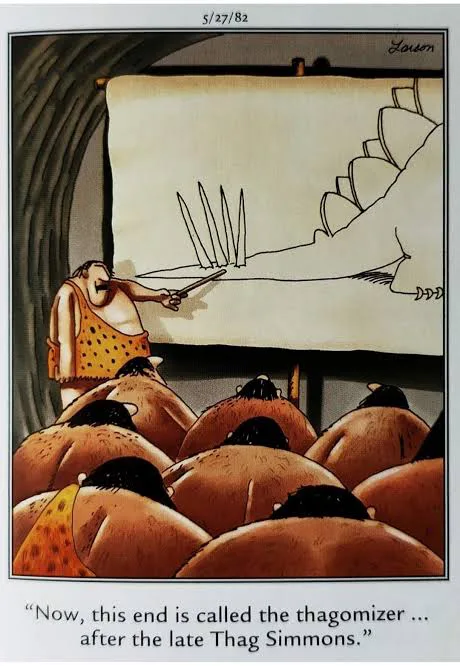 Fun fact: The spikes on a stegosaurus' tail never had a name, until Gary Larson named it in this cartoon. The scientific community - always fans of the far side - adopted the name and made it official.