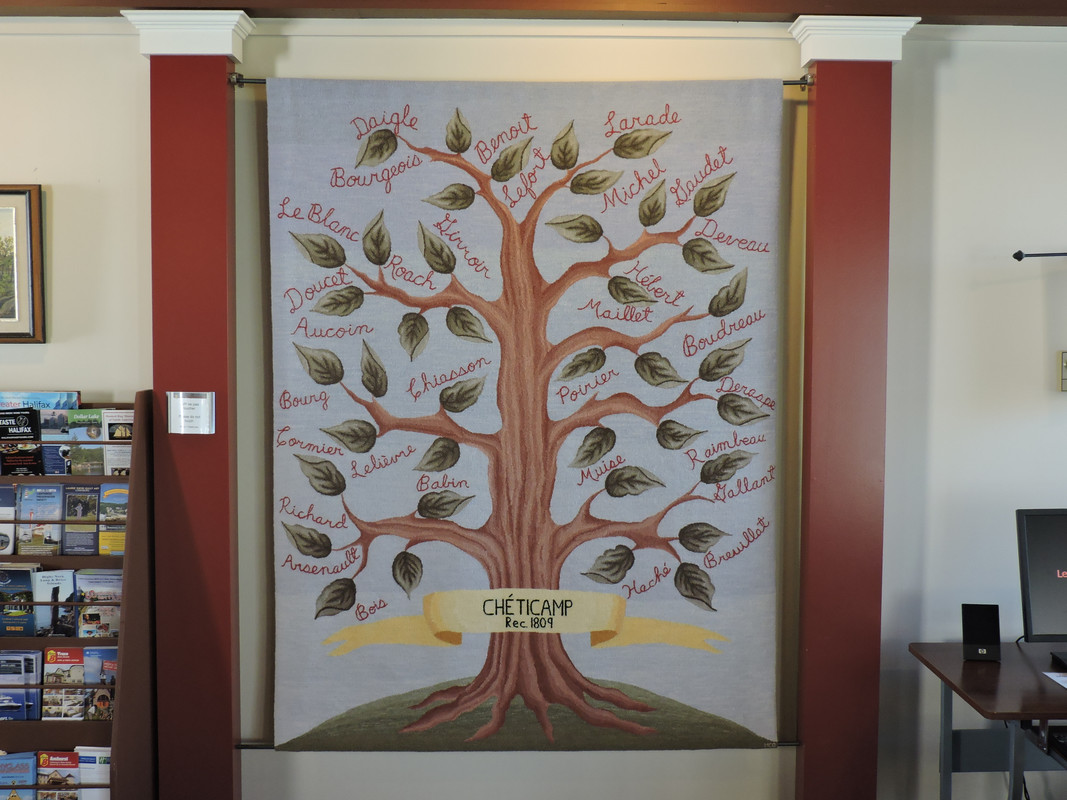 On a trip to Nova Scotia, we stopped in the Acadian fishing village of Cheticamp. I saw this tapestry of family names in the village.
