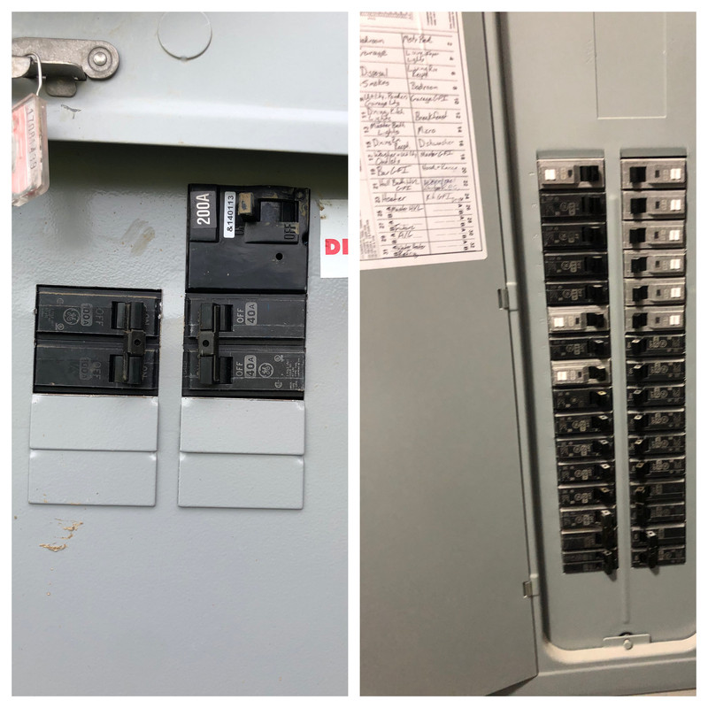 Then the right picture is the breaker inside my house. An electrician friend I text said the bottom right switch should be the back feed switch.
