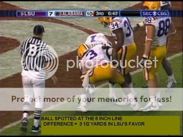 The interception was iffy at best, coulda gone either way, I'd be inclined to call it an Int myself. I also think Bama got robbed on the spot that led to the LSU safety. An LSU player was standing at the 4 yard line, the ball hit at the 2 yard line and bounced toward the player, he put his hand down, and the ball changed direction back toward the goal line. That ball should have been placed at the 4 yard line, and if it had, the safety never would have happened. Result 2 points for LSU and great field position on the free kick. I'm sure if the picture poster wanted to, he could post these pics as well, but I would be willing to bet that he doesn't, because it doesn't help his argument about biased refs, and in fact hurts it.