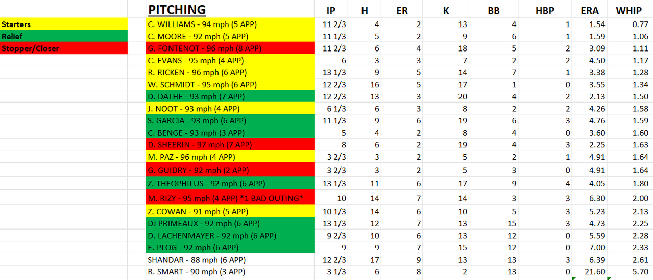 Based on the stats I have of the fall (excluding yesterday at SE) the pitching staff has 196/105 K/BB in 154 IP. When you take into account that 50 BB come from 5 individuals that is pretty good stuff.