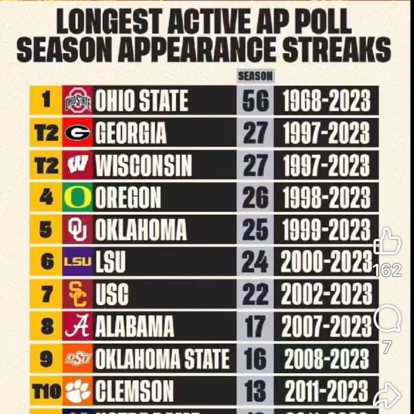 re: NCAAF-Longest Streaks of being ranked in the AP Poll at some point during season thru 2023