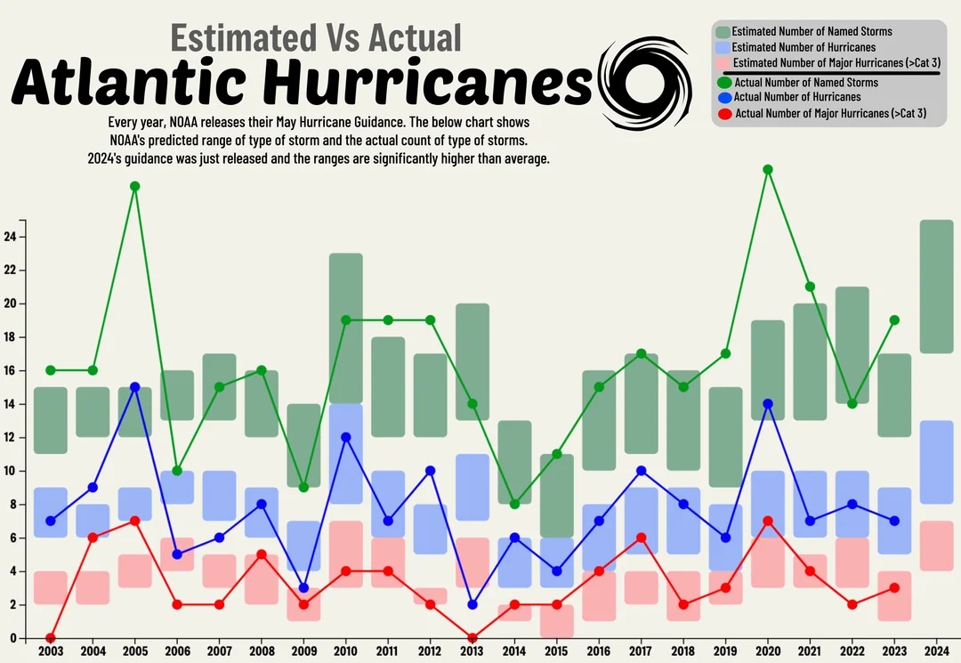This is the NOAA atlantic named storms & hurricane predictions vs reality from 2003 to 2024