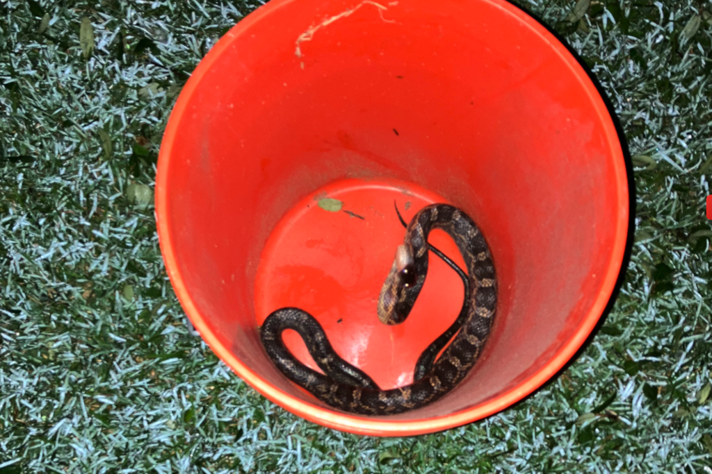 Big storm pushed this guy into the tree out front. He was headed toward a nested dove so I moved him out. Kinda crazy he was rattling once I got him in the bucket emulating a rs...