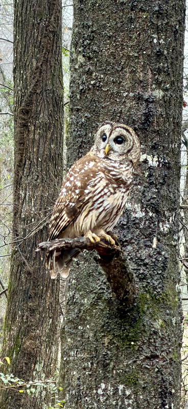 Was driving down the road awhile back and a barred owl flew up from the ditch and landed in a tree by the road. Turned around and drove back by and got a quick picture with my cell phone.