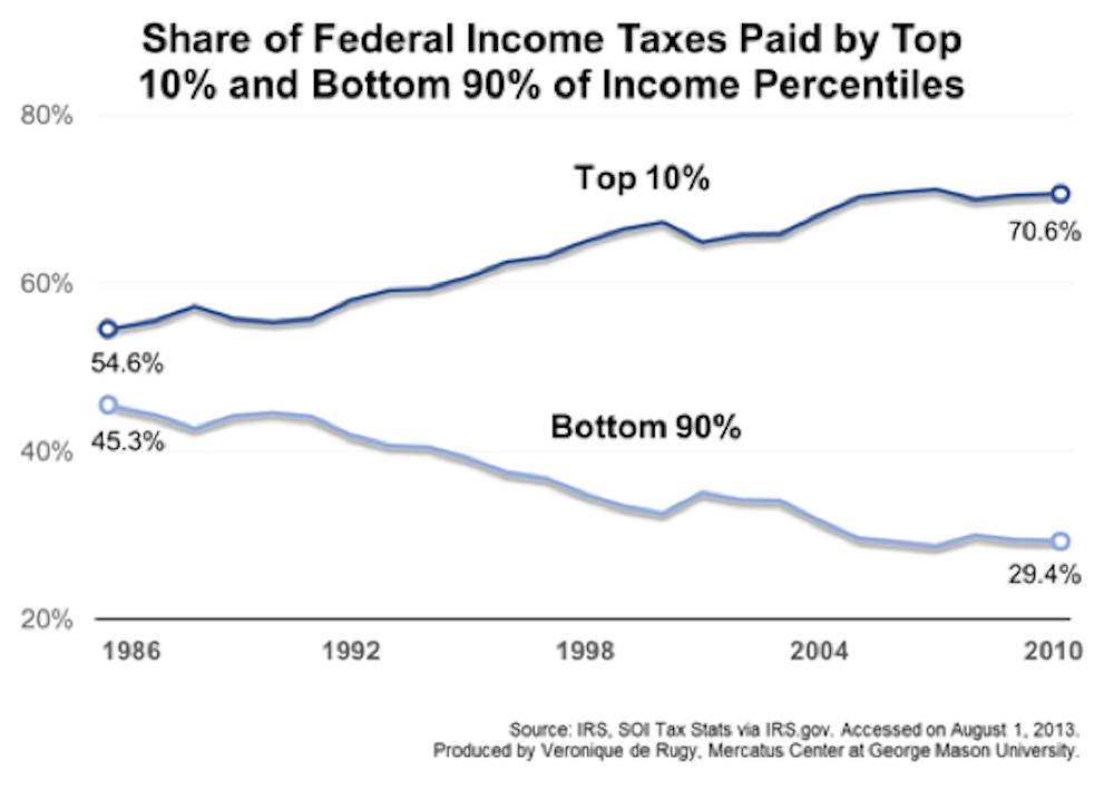 In 1960, the top 1% paid about 13% of all federal income taxes; today, they pay roughly 40-45%.