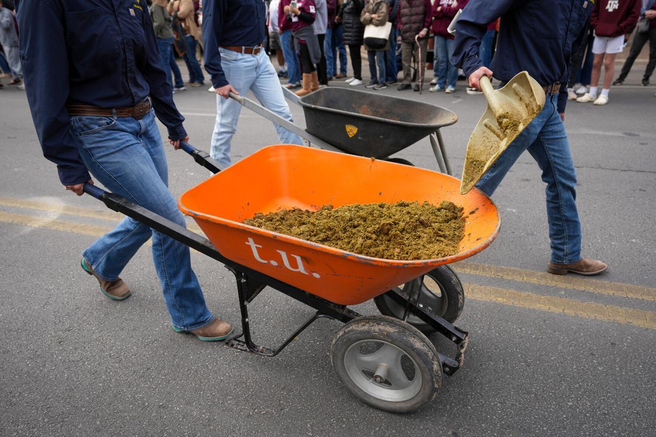 Check out the tea-sips, straight-up copying Texas A&M’s longstanding Parsons Mounted Cavalry tradition of the cleanup crew with a crap orange t.u. wheelbarrow.