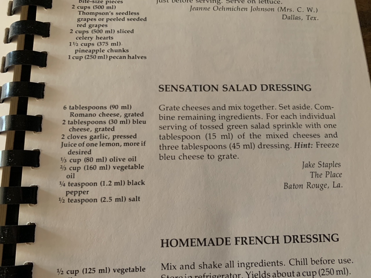After hearing about a cookbook made in 1976 by LSU called "Tiger Bait", I found a copy of it online for $6.95 (every other copy was $70 or so!)... On page 55, I found the original Sensation Salad dressing submitted by the Jake Staples of The Place. Here it is - I hope that you enjoy it!