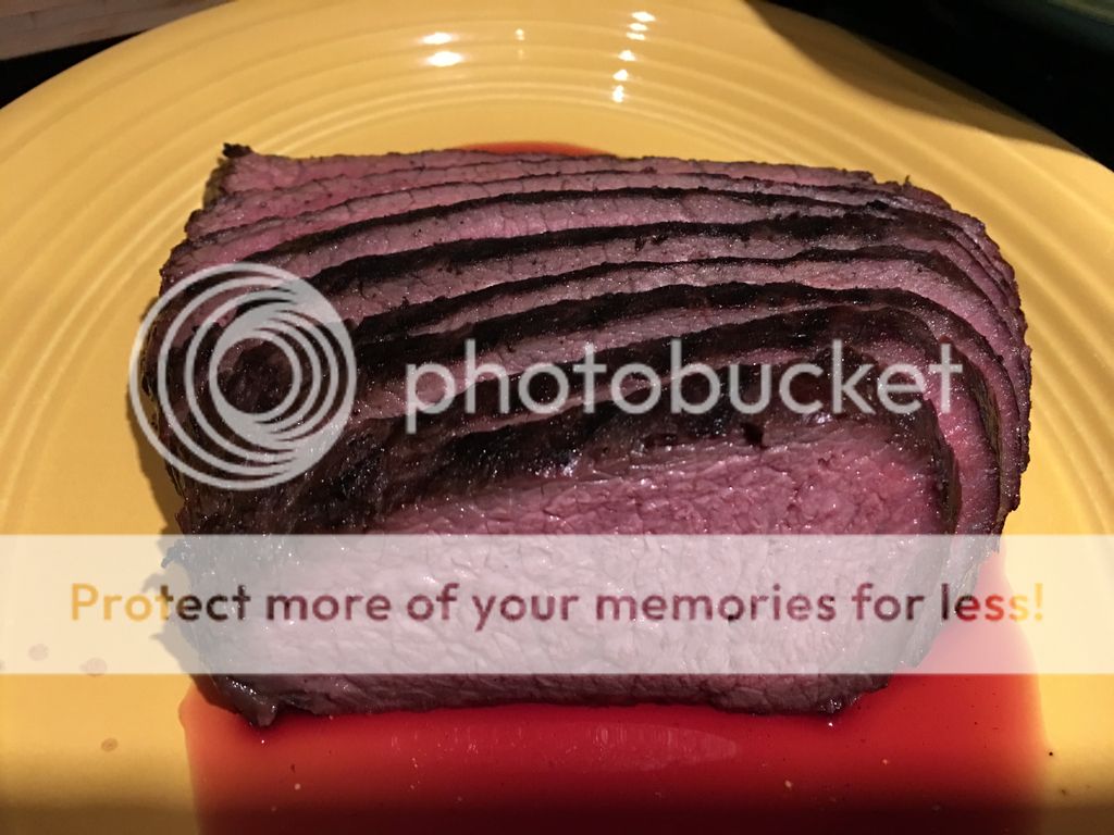Marinate in Dale's seasoning and minced garlic for a couple hours, pull from the refrigerator, let it come up to nearly room temp. Pat dry before placing in indirect heat at 275 until internal temp comes up to about 130-135. Pull to rest, fire up the grill for searing and sear each side for 1-2 minutes without burning it. Pull to rest for about 5-10 minutes and slice.