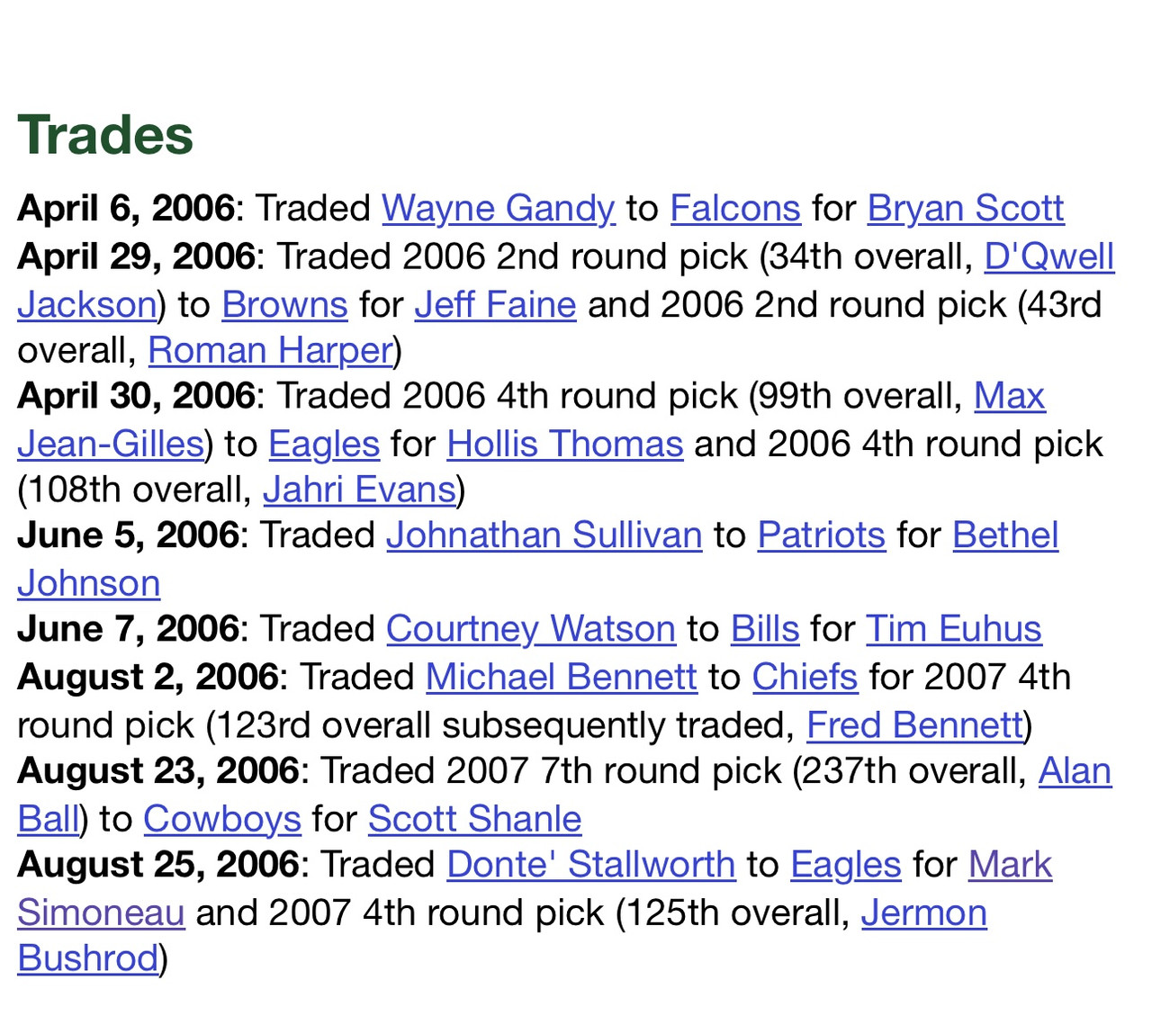 Small trade downs for starter upgrades (Hollis Thomas, Jeff Faine), low value pick trades or for starters/solid contributors (Shanle), trading Stallworth on a contract year (4th rounder+ starting MLB in Simoneau).