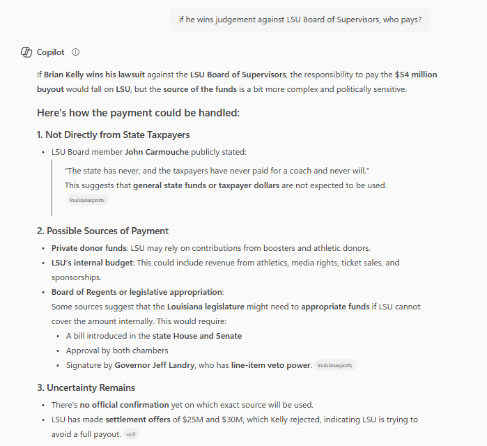 The lawsuit is against the LSU Board of Supervisors. If he wins, there will be some deciding on where the funds come from. While the media may seem to be hyping up the state to pay (what I heard on radio), LSU may be able to self-fund through donors and athletic budget. If the donors balk, it is going to get interesting. If it makes it to Board of Regents or legislative appropriation, essentially taxpayers are paying.